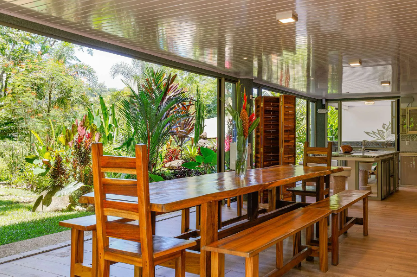 Property: A private sanctuary in the lush hills. Features include a total of 21 beds available, indoor & outdoor Chef's kitchen dining areas, private river access, fast Wi-Fi, and daily housekeeping.